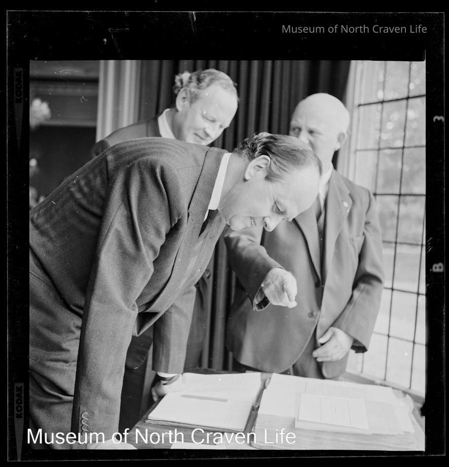 A 2½ x 2½" monochrome acetate film negative. A portrait of a man studying a set of documents on a table in Settle Town Hall; two other men stand beside himCollection