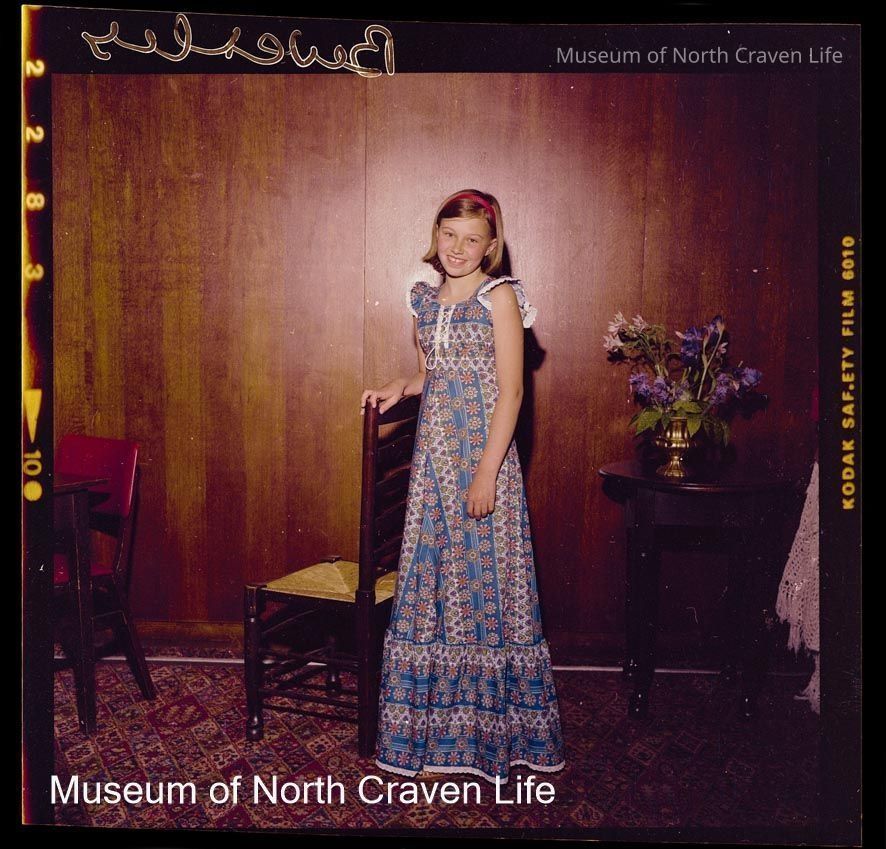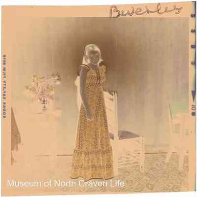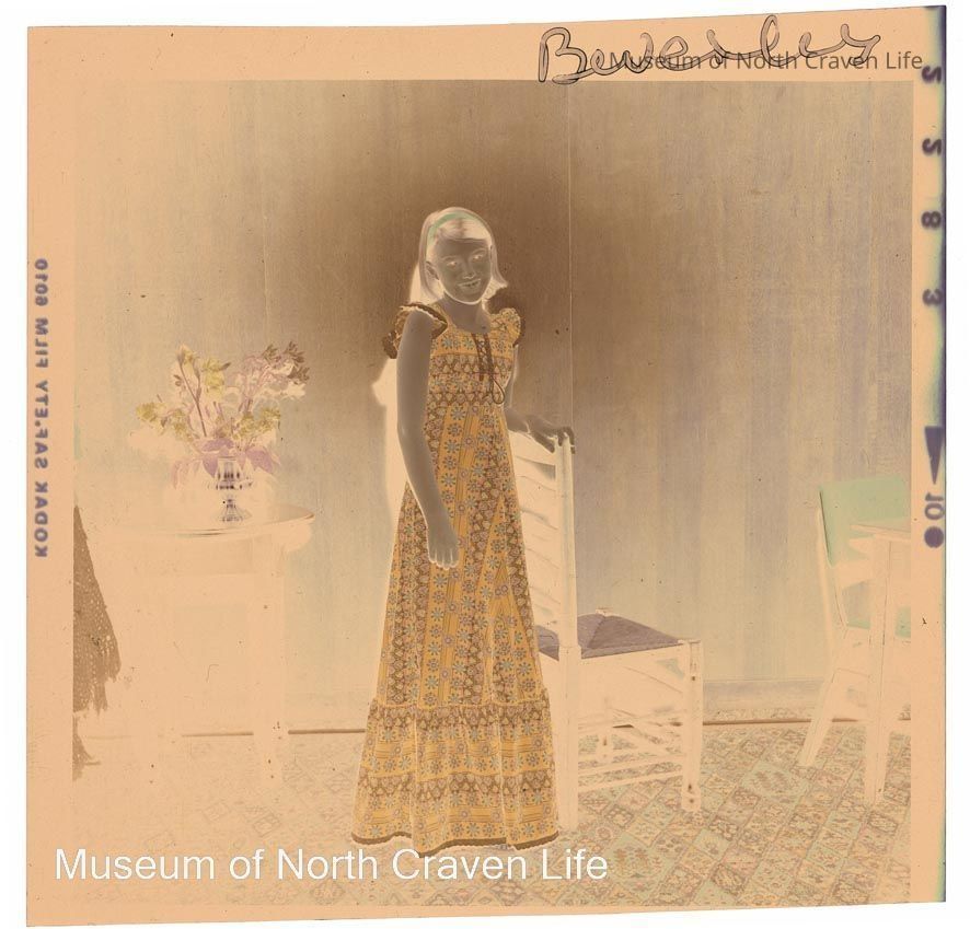 A 2¼" colour film negative. A posed portrait of a young girl standing, one hand resting on the back of a chair. An annotation to the negative identifies her as 'Beverley'Collection