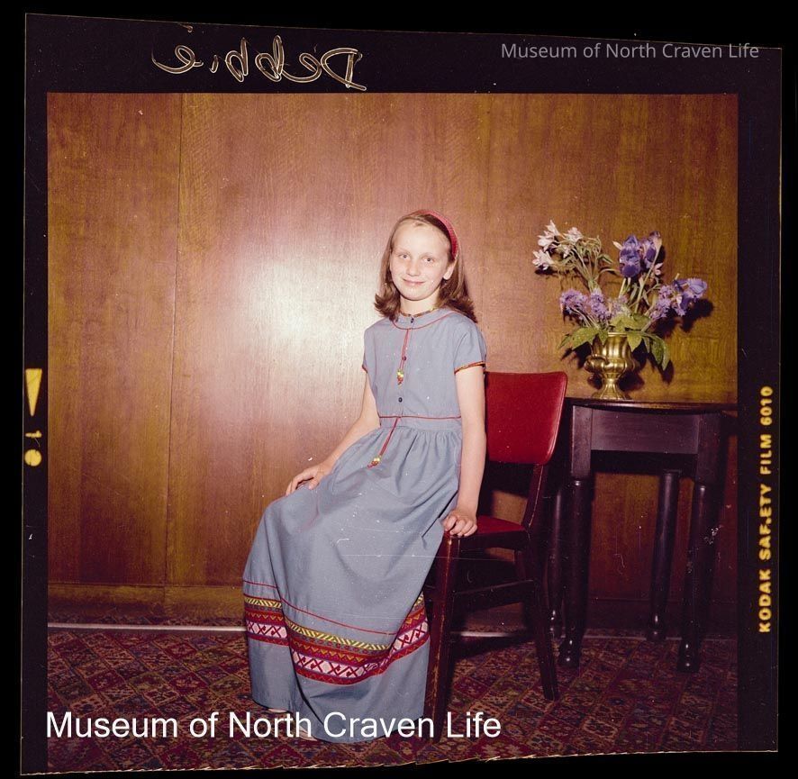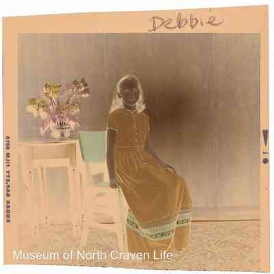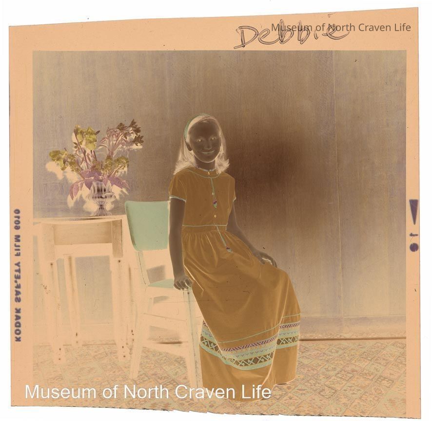A 2¼" colour film negative. A posed portrait of a young girl seated on a chair. An annotation to the negative identifies her as 'Debbie'Collection