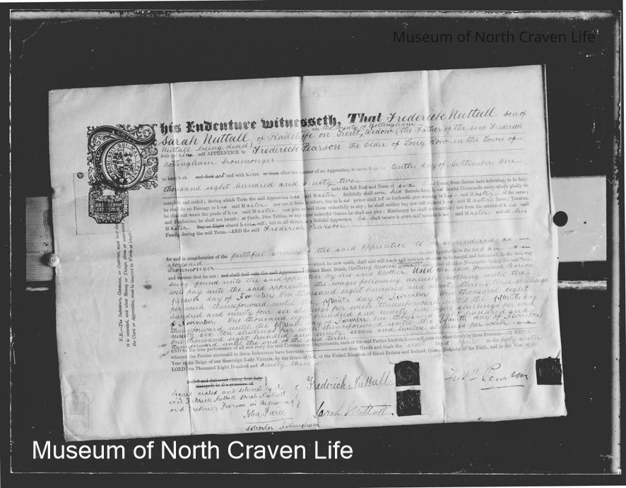 A quarter-plate gelatin silver glass negative. An image of the Indenture document apprenticing Frederick Nuttall of Radcliffe on Trent (Nottingham) to Frederick Pearson of Nottingham, Ironmonger. Dated 10/09/1892Collection