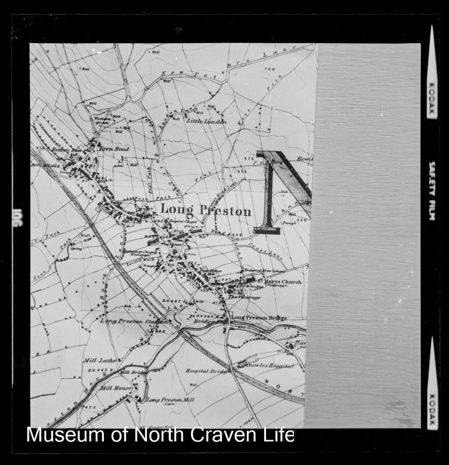 A 2½ x 2½" monochrome acetate film negative. An image of a map of Long Preston produced by Long Preston Parish Council ?Collection