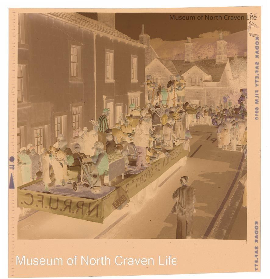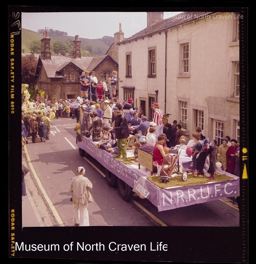 A 2¼" colour film negative. A carnival float created by North Ribblesdale Rugby Union Club - "A question of sport" - in Station Road with spectators looking onCollection