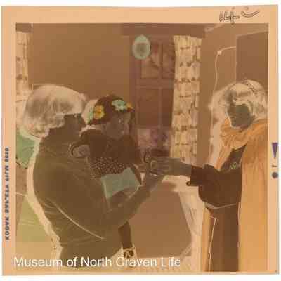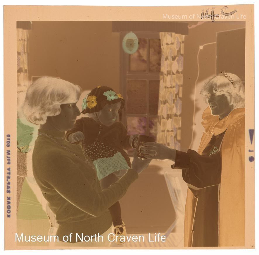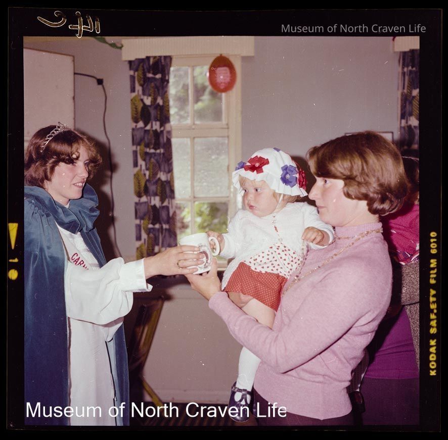 A 2¼" colour film negative. A group portrait of the Carnival Queen in full regalia, presenting a commemorative mug to a woman holding an infantCollection
