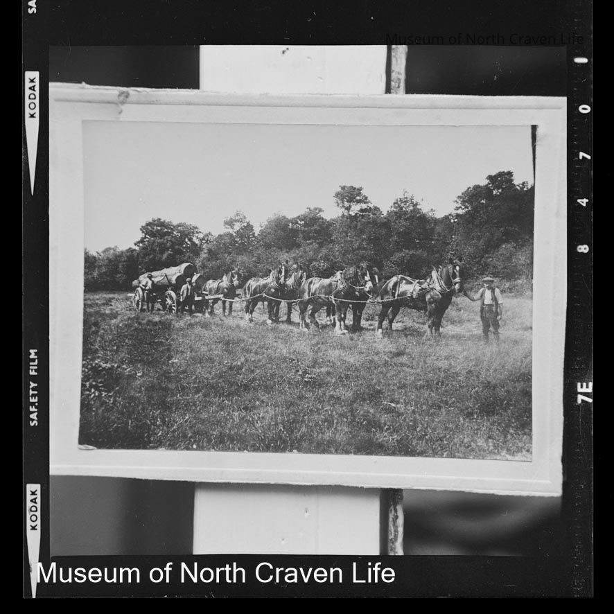 A 2½ x 2½" monochrome acetate film negative. A view of a man, accompanied by two others, leading a team of six horses which pull a load of felled timberCollection