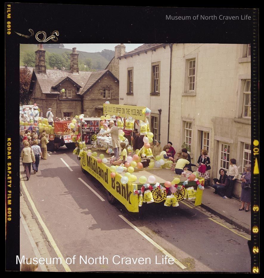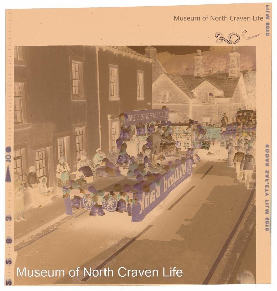 A 2¼" colour film negative. The Midland Bank carnival float in Station Road with spectators looking onCollection