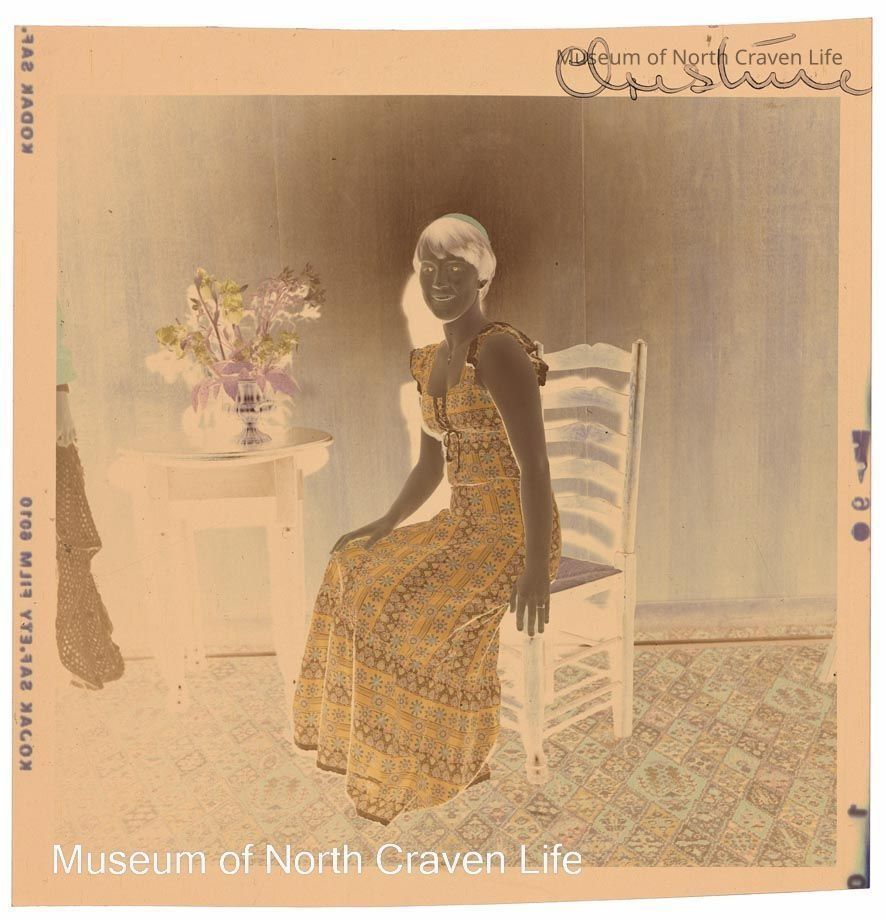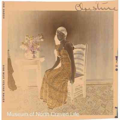 A 2¼" colour film negative. A posed portrait of a young girl seated on a chair. An annotation to the negative identifies her as 'Christine'Collection
