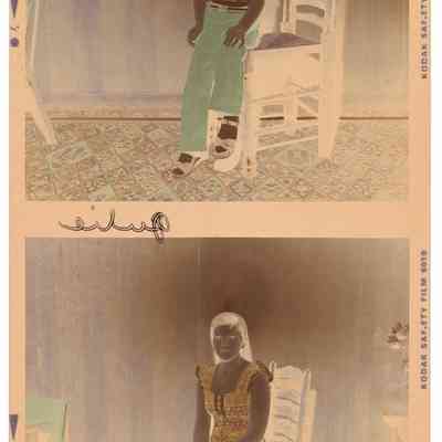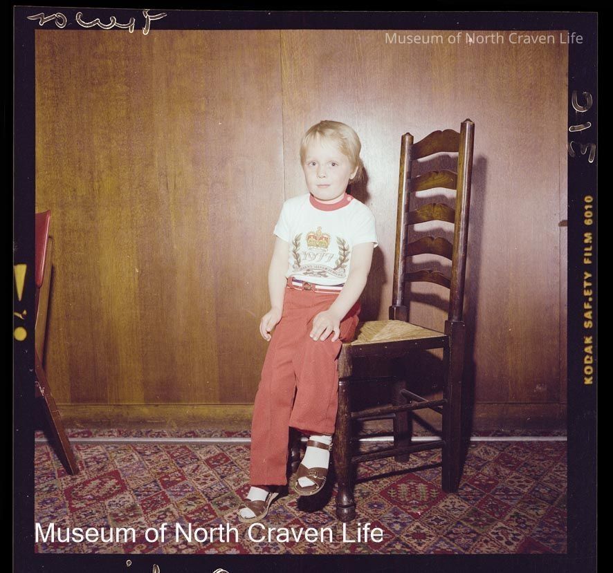 A 2¼" colour film negative. A posed portrait of a young boy perched on a chair. An annotation to the negative identifies him as 'Trevor'Collection