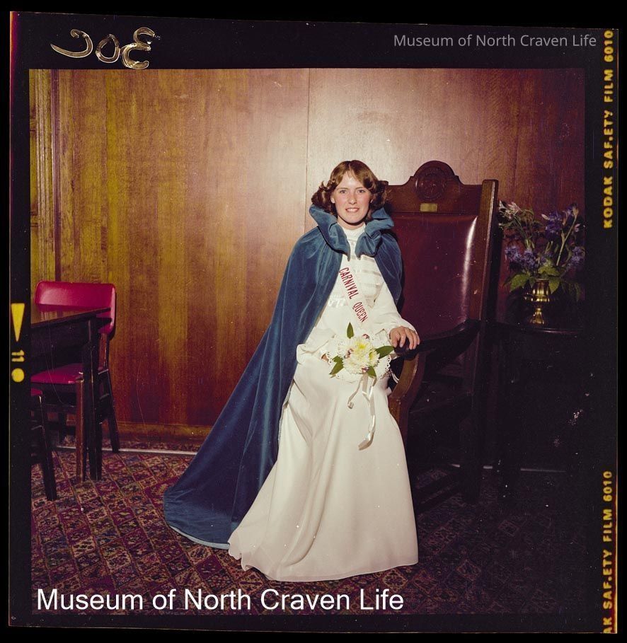 A 2¼" colour film negative. A posed portrait of the Carnival Queen in full regalia, seated on a high-backed chairCollection