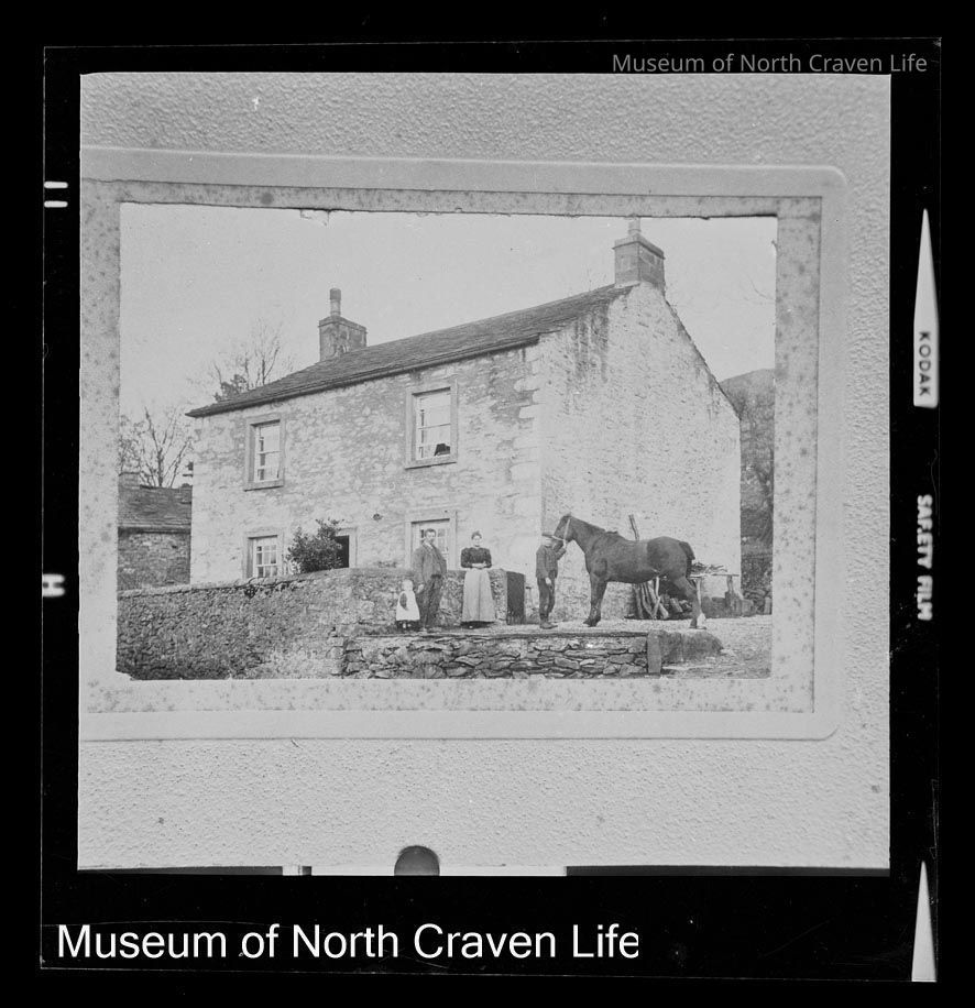 A 2½ x 2½" monochrome acetate film negative. A view of a family group (man, woman and small child) standing beside a man who holds a horse in front of a white houseCollection