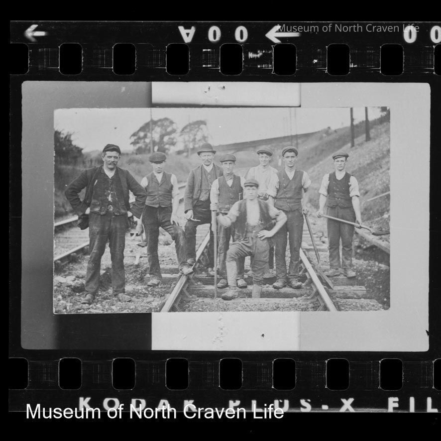 A 35mm monochrome film negative. A group portrait of 8 railway workers with shovels, standing on the trackCollection