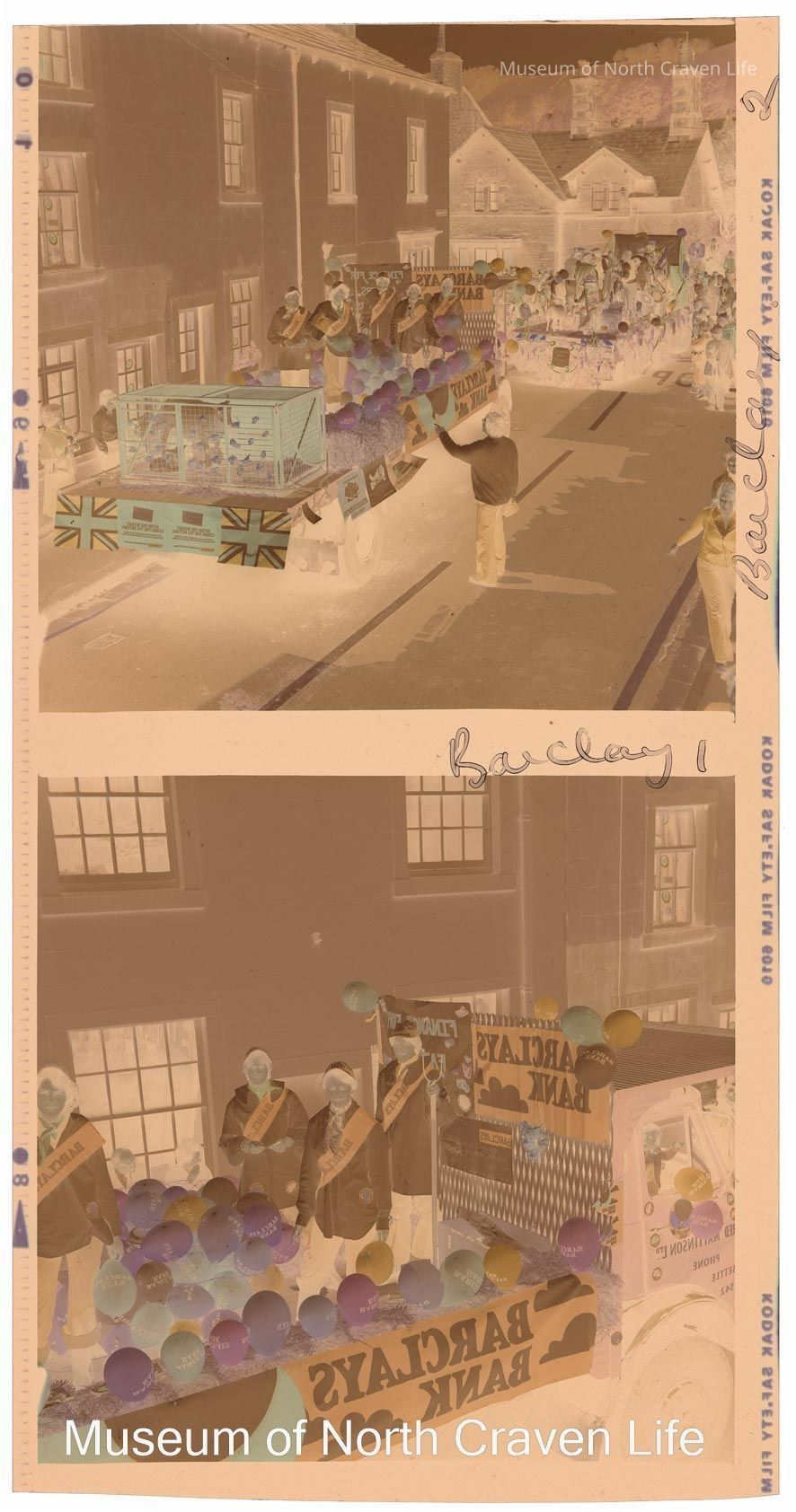 A 2¼" colour film negative. The Barclays Bank carnival float with spectators looking on. An annotation to the negative states 'Barclays'Collection