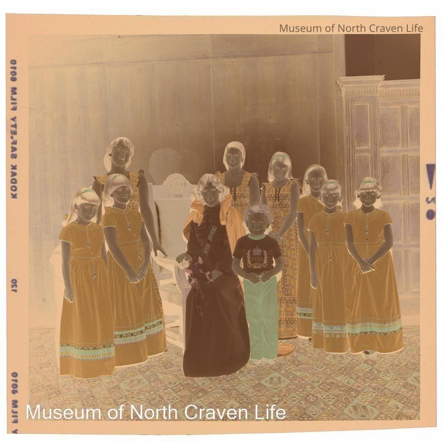 A 2¼" colour film negative. A group portrait of the Settle Carnival Queen in full regalia, seated in a high-backed chair, with a number of attendantsCollection