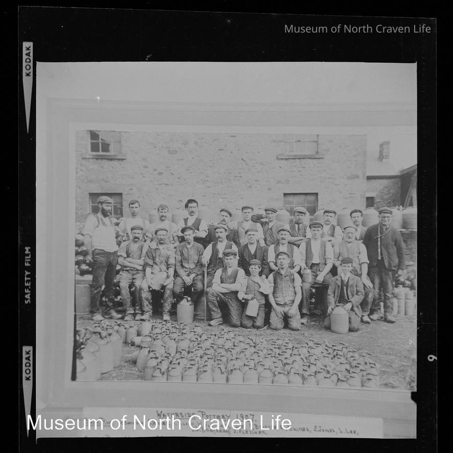 A 2½ x 2½" monochrome acetate film negative. A group portrait of employees at the Waterside Pottery. People present in the image are identified by name at the bottomCollection
