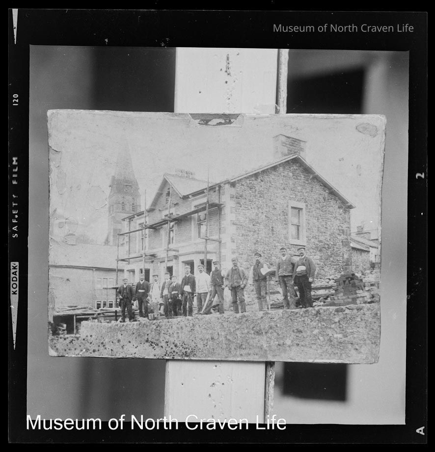 A 2½ x 2½" monochrome acetate film negative. A view of a house with scaffolding and workmen ; the spire of All Saints Church appears in the backgroundCollection