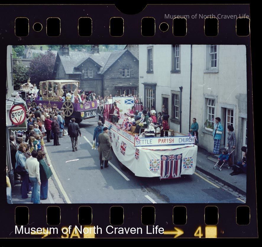 A 35mm colour film negative. A view of the Settle Parish Church carnival float in Station Road with a crowd of onlookersCollection