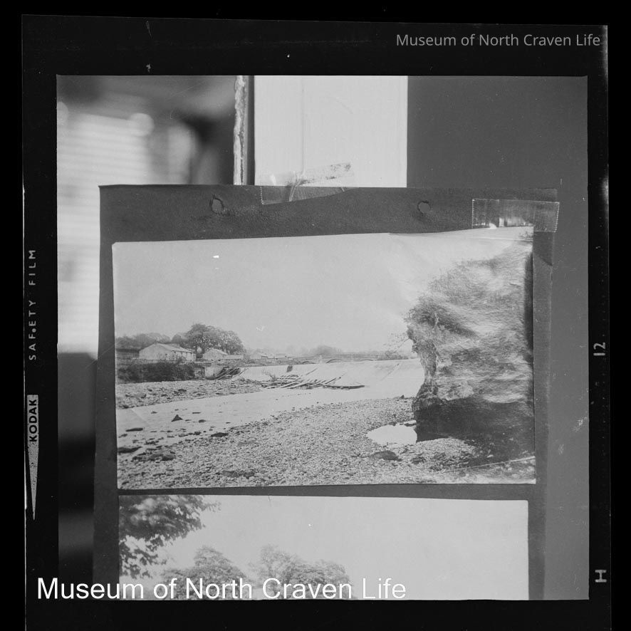 A 2½ x 2½" monochrome acetate film negative. A view of a river with buildings and a three span bridge in the backgroundCollection