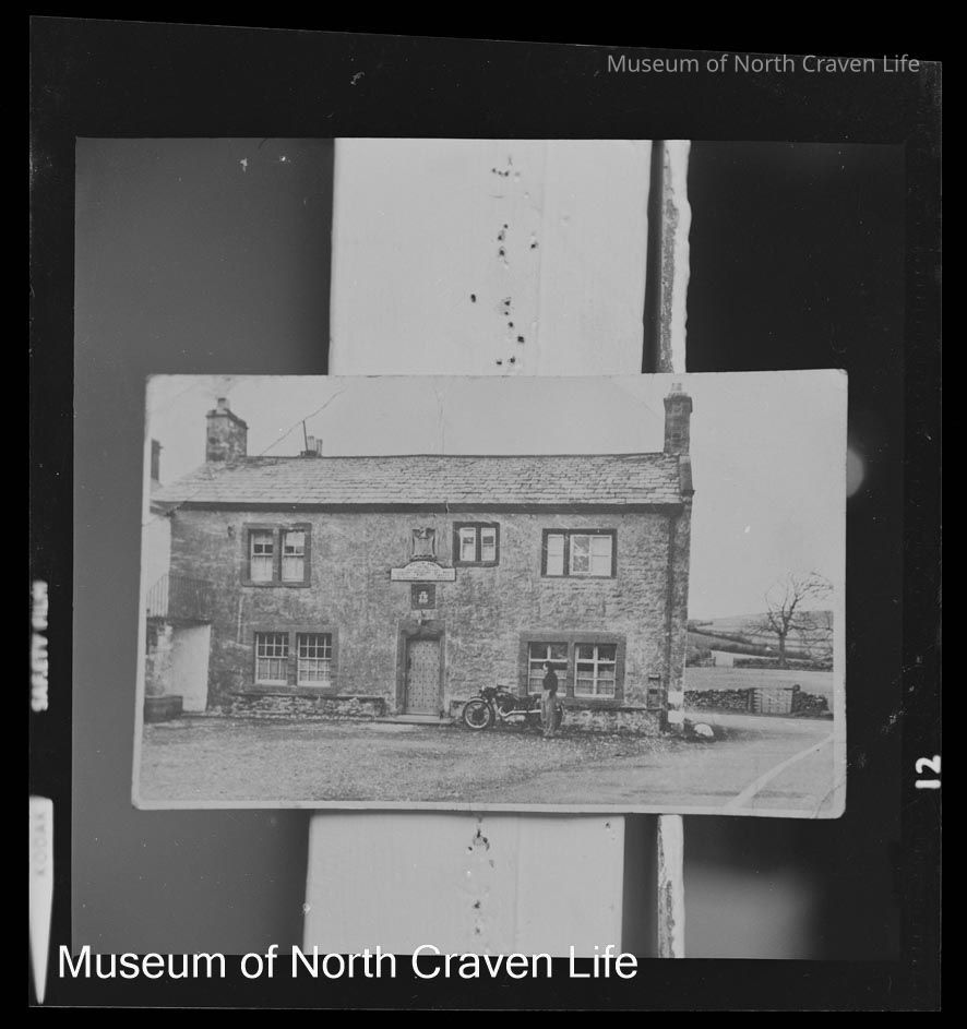 A 2½ x 2½" monochrome acetate film negative. A view of the Marton Inn Hotel, Ingleton (now Marton Arms). A woman stands in front of the hotel with a motorcycleCollection
