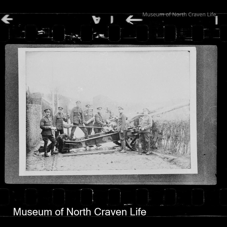 A 35mm monochrome film negative. An image of a group of seven soldiers in uniform with artillery, 1914-18Collection