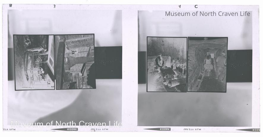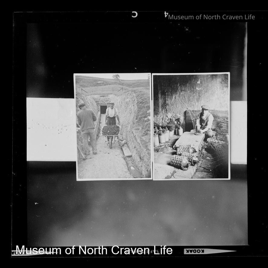 A 2½ x 2½" monochrome acetate film negative. An image of 2 photographic prints. A view of working men : an excavation - a man pushes a barrow laden with rubble ; a weaver at work on wicker bottlesCollection