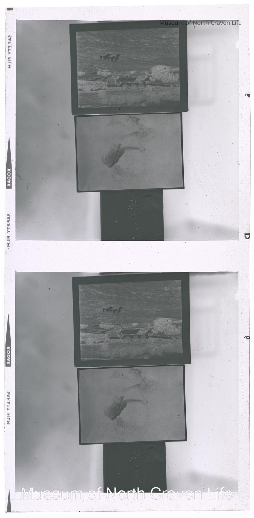 A 2½ x 2½" monochrome acetate film negative. An image of 2 photographic prints. A view of a working man, possibly a miner ; a view of a farm with geese in the foregroundCollection