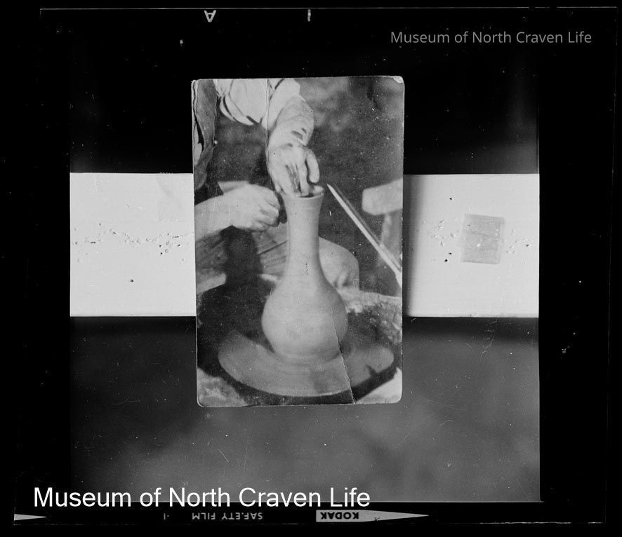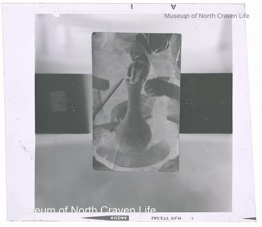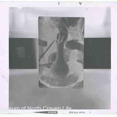 A 2½ x 2½" monochrome acetate film negative. An image of a photograph print of a potter at his wheel, turning a potCollection