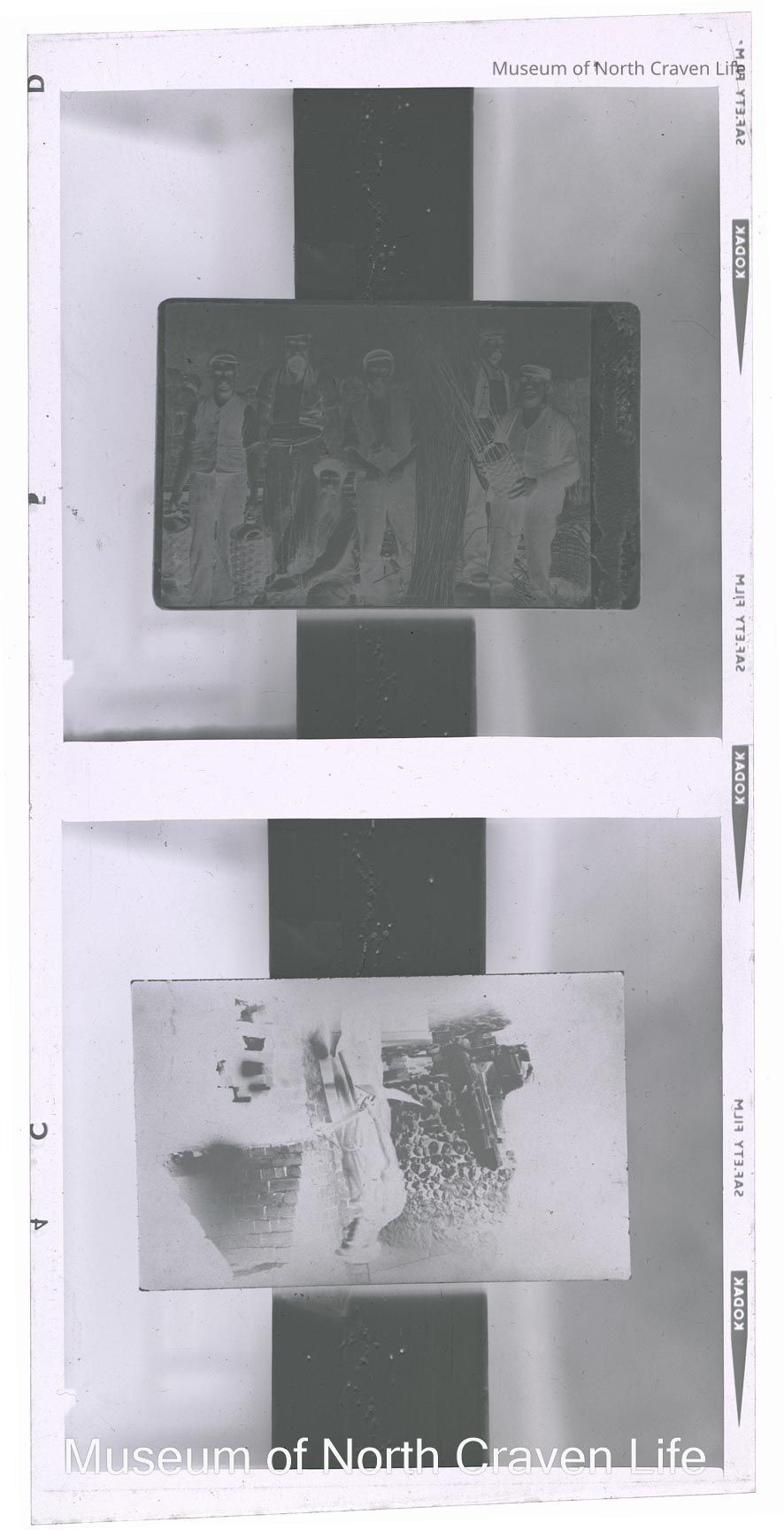 A 2½ x 2½" monochrome acetate film negative. An image of a photograph print of a man with a shovel in front of a kiln?Collection