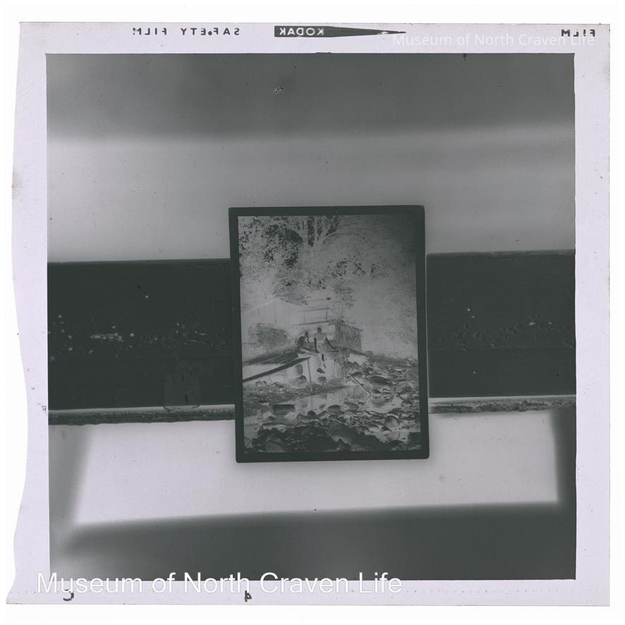 A 2½ x 2½" monochrome acetate film negative. An image of a photographic print of two young women seated beside a stream. Behind them looms a large mill wheelCollection