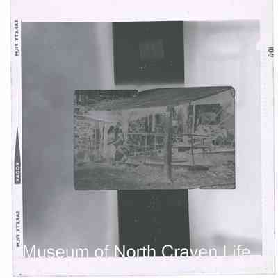 A 2½ x 2½" monochrome acetate film negative. An image of a photographic print. A view of industrial premises : a man stands beside a large cog wheel with a barrowCollection