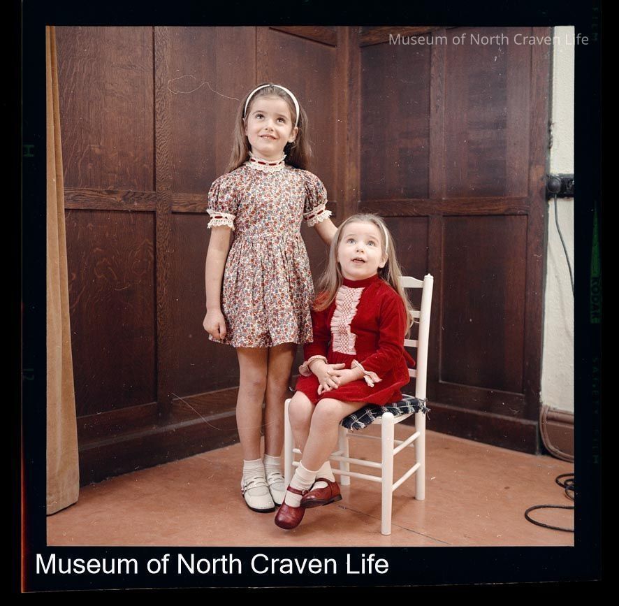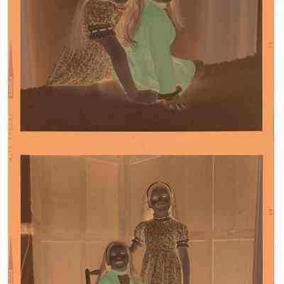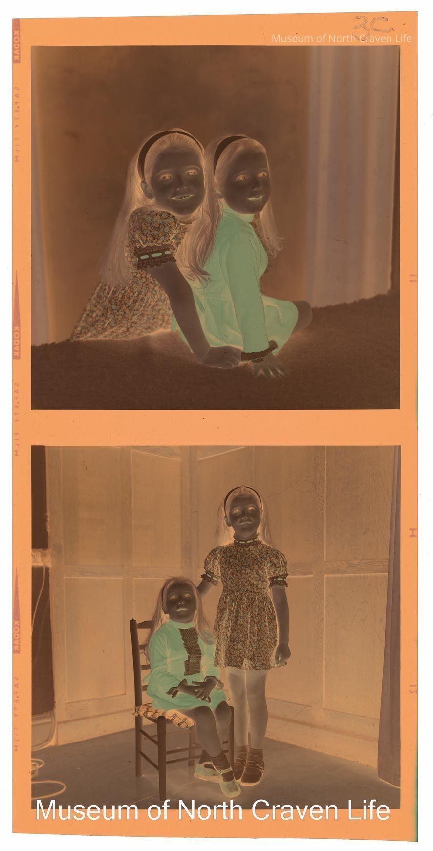 A 2¼" colour film negative. A portrait of two young girls, one standing and one seated on a white chairCollection