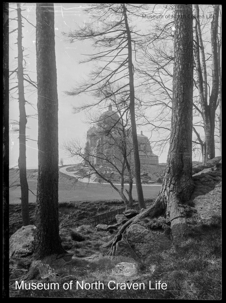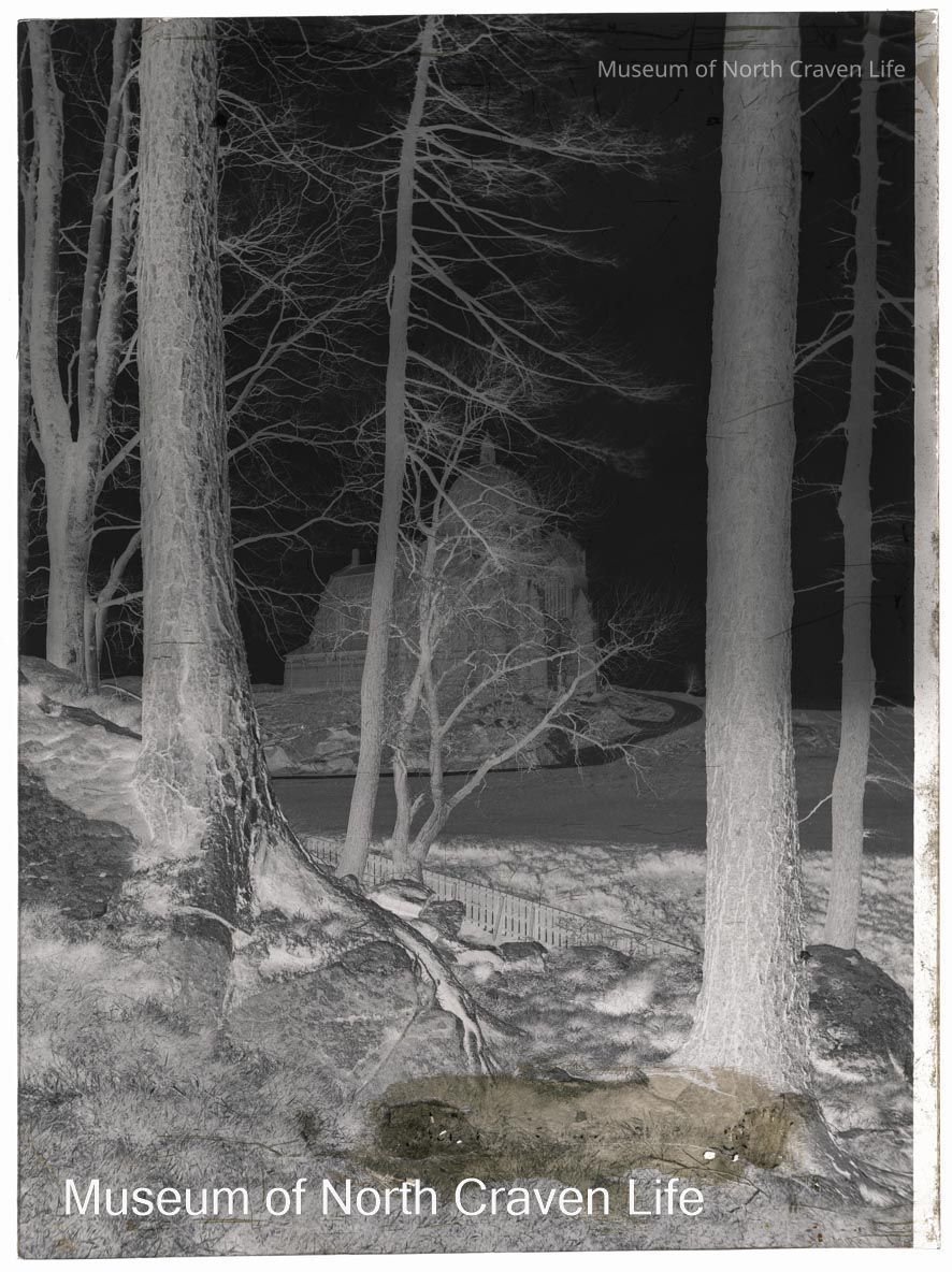 A half-plate gelatin silver glass negative. A distant view of the exterior of Giggleswick School Chapel through trees from the north-eastCollection