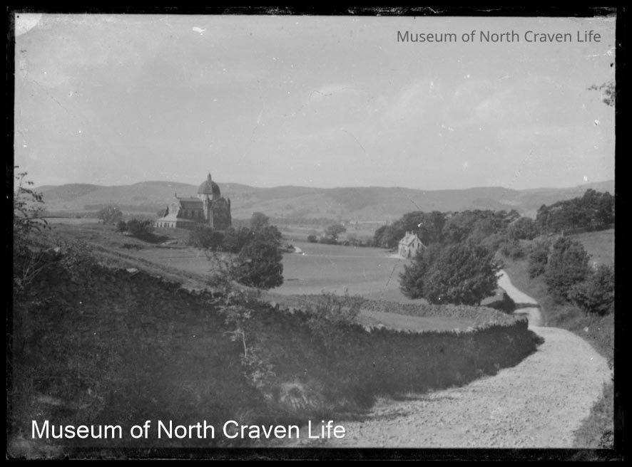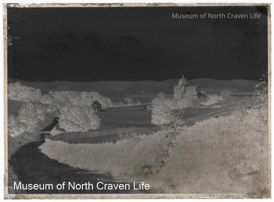 A half-plate gelatin silver glass negative. A distant view of the exterior of Giggleswick School Chapel through trees from a lane, seen from the south-westCollection