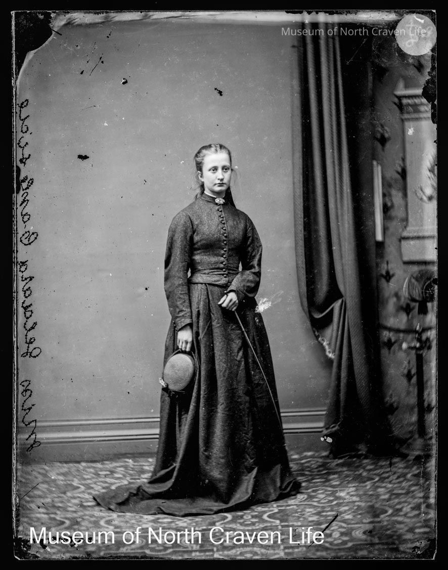 A quarter-plate wet collodion negative. A full length studio portrait of Miss Geldard, Cappleside. She stands, holding a hat and riding cropCollection