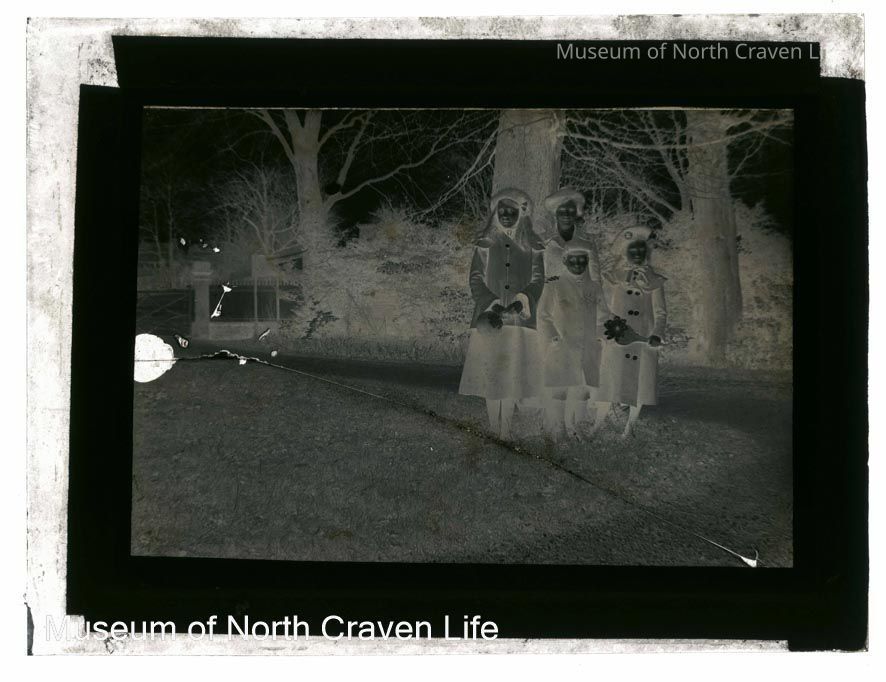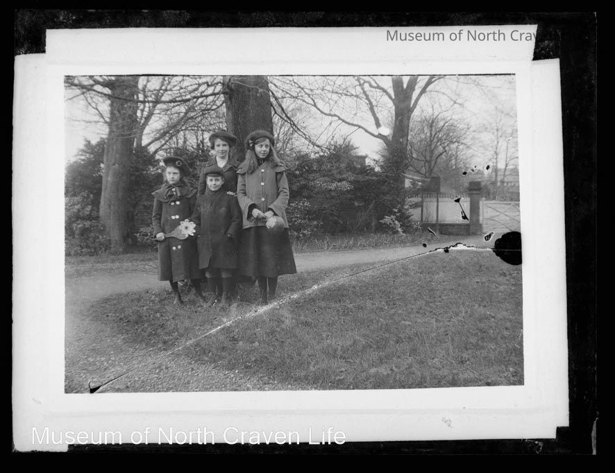 A quarter-plate gelatin silver glass plate negative. An exterior view of a family group of four, three children and one adult, standing in front of a large treeCollection