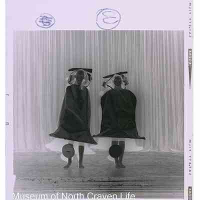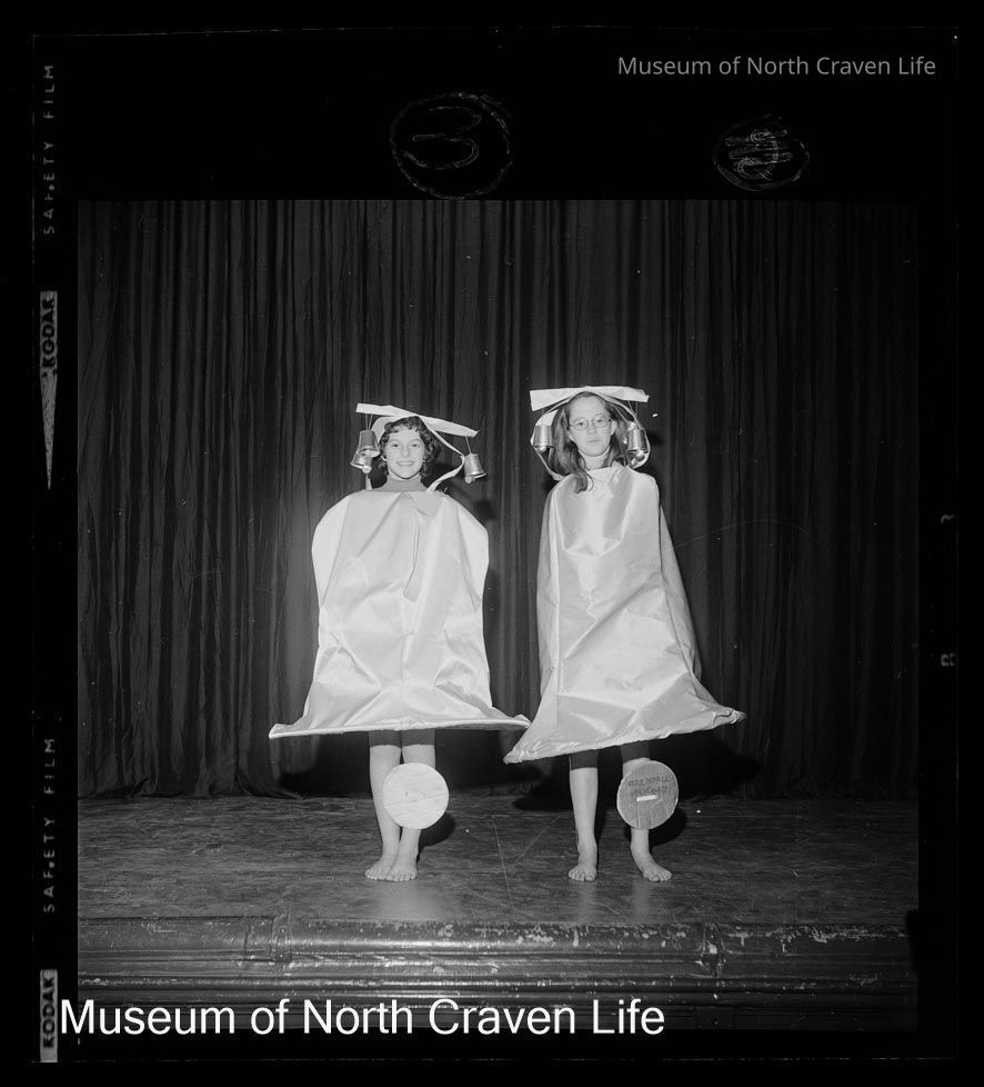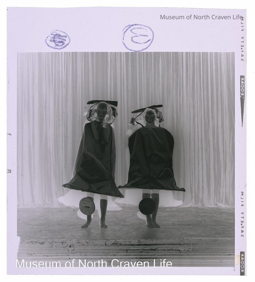 A 2¼" monochrome acetate film negative. A portrait of two young women on stage at Victoria Hall, dressed as bellsCollection