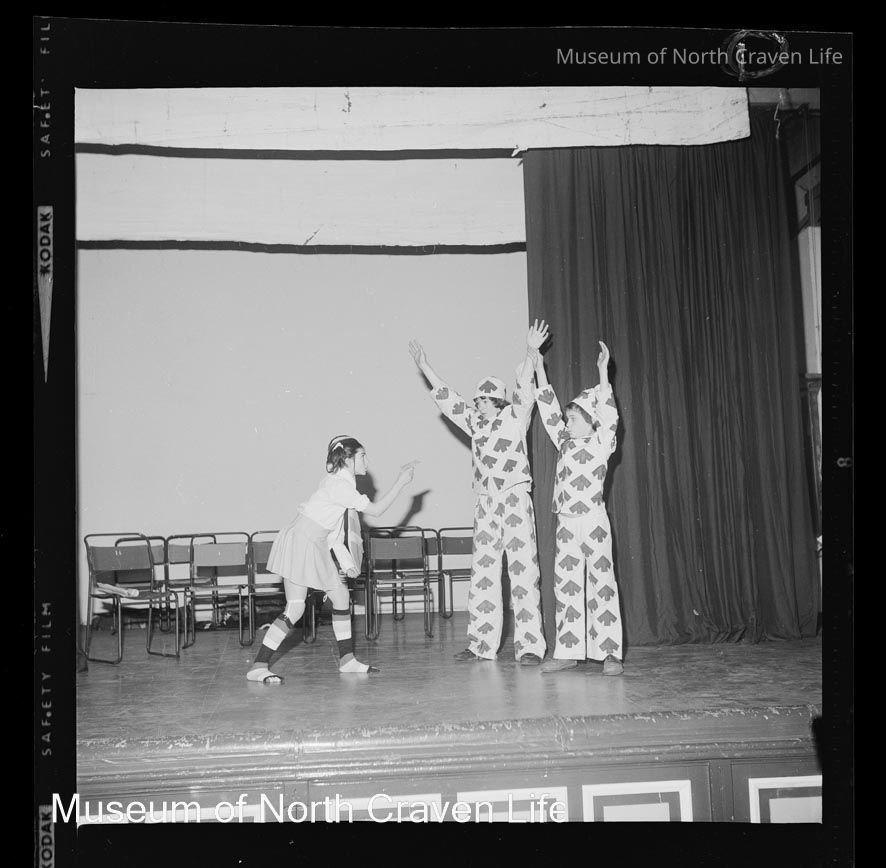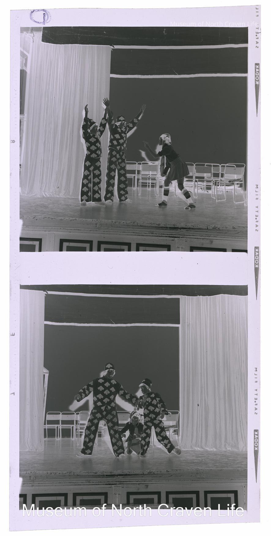 A 2¼" monochrome acetate film negative. A group portrait of three young performers on stage at Victoria Hall: two boys in prison uniforms with a young girl, acting a scene from a dramaCollection