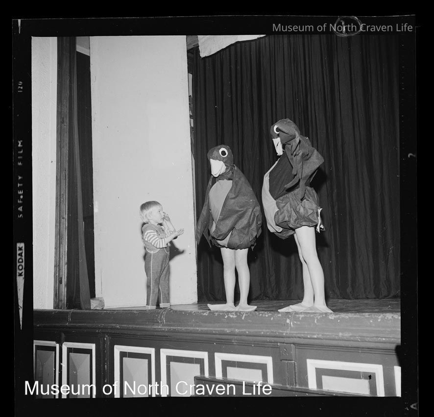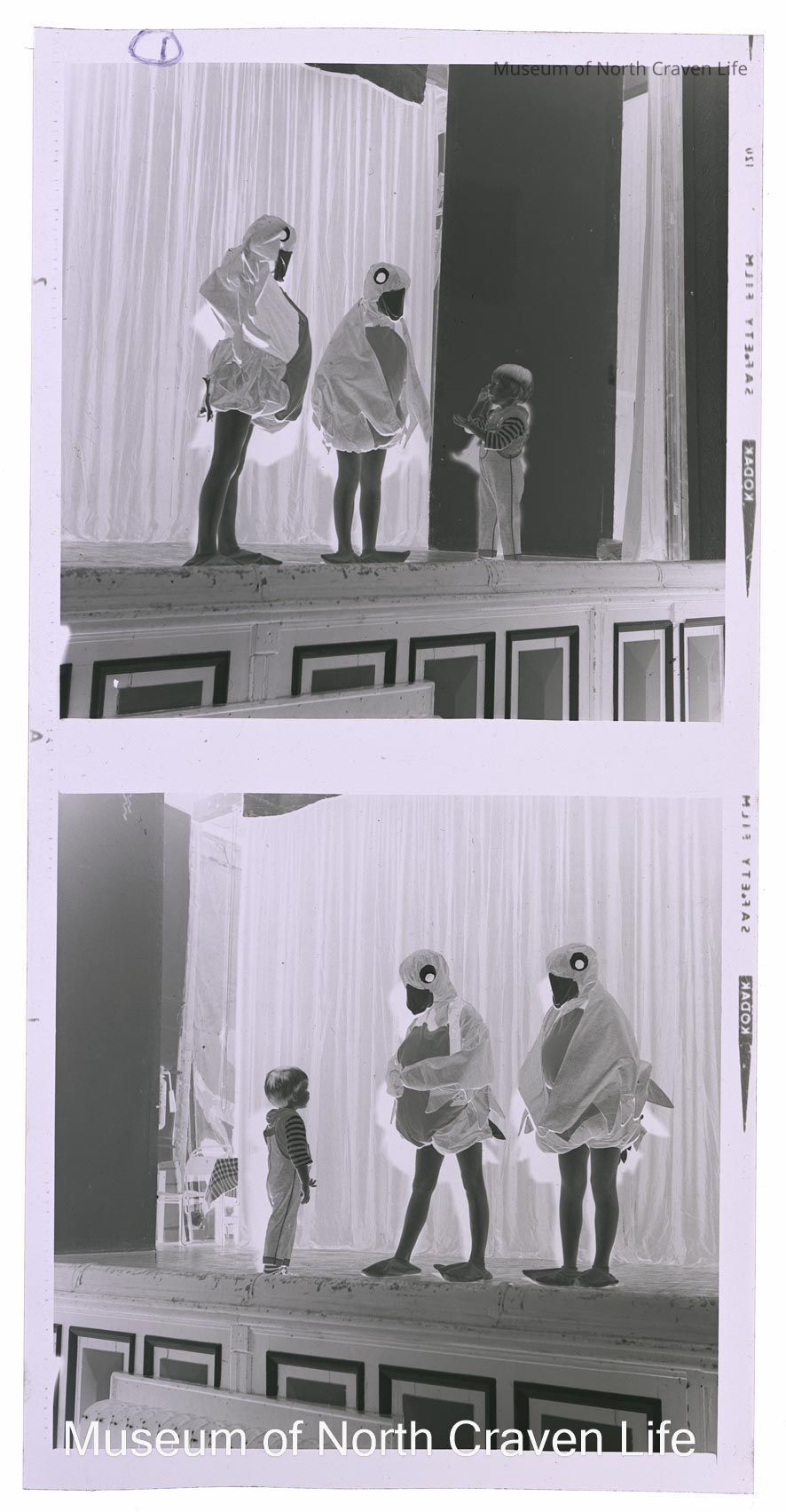 A 2¼" monochrome acetate film negative. A group portrait of two performers on stage in bird costumes at Victoria Hall, watched by a young childCollection