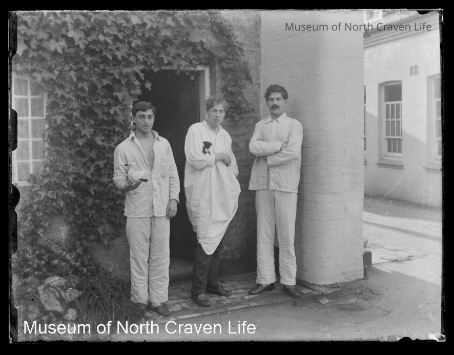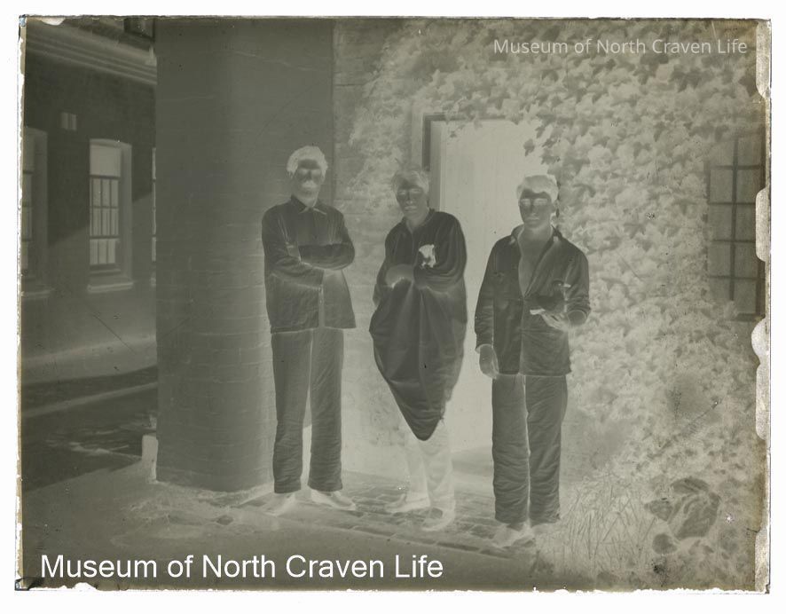 A quarter-plate gelatin silver glass plate negative. A full length portrait of three young men standing outside an ivy-clad door. One holds a toy duck in the palm of his hand, another clutches a toy under his right arm ; the third stands with his arms crossedCollection