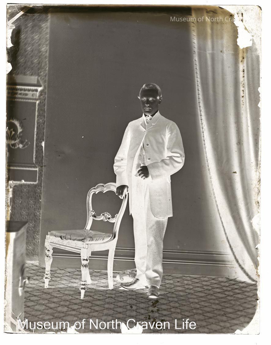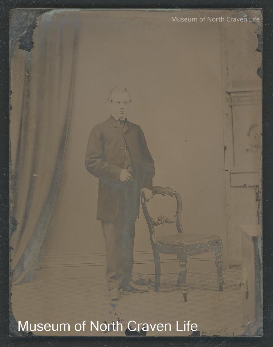 A quarter-plate wet collodion negative. A full length studio portrait of a man (Mr Lord?) standing beside a chair. His left hand rests on the chair backCollection