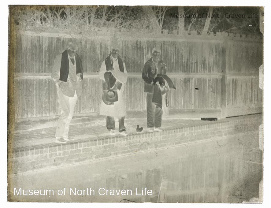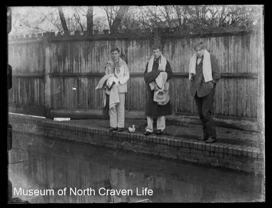 A quarter-plate gelatin silver glass plate negative. A full length portrait of three young men standing beside some water with a wooden fence behind them. A toy duck sits on the edge of the pondCollection