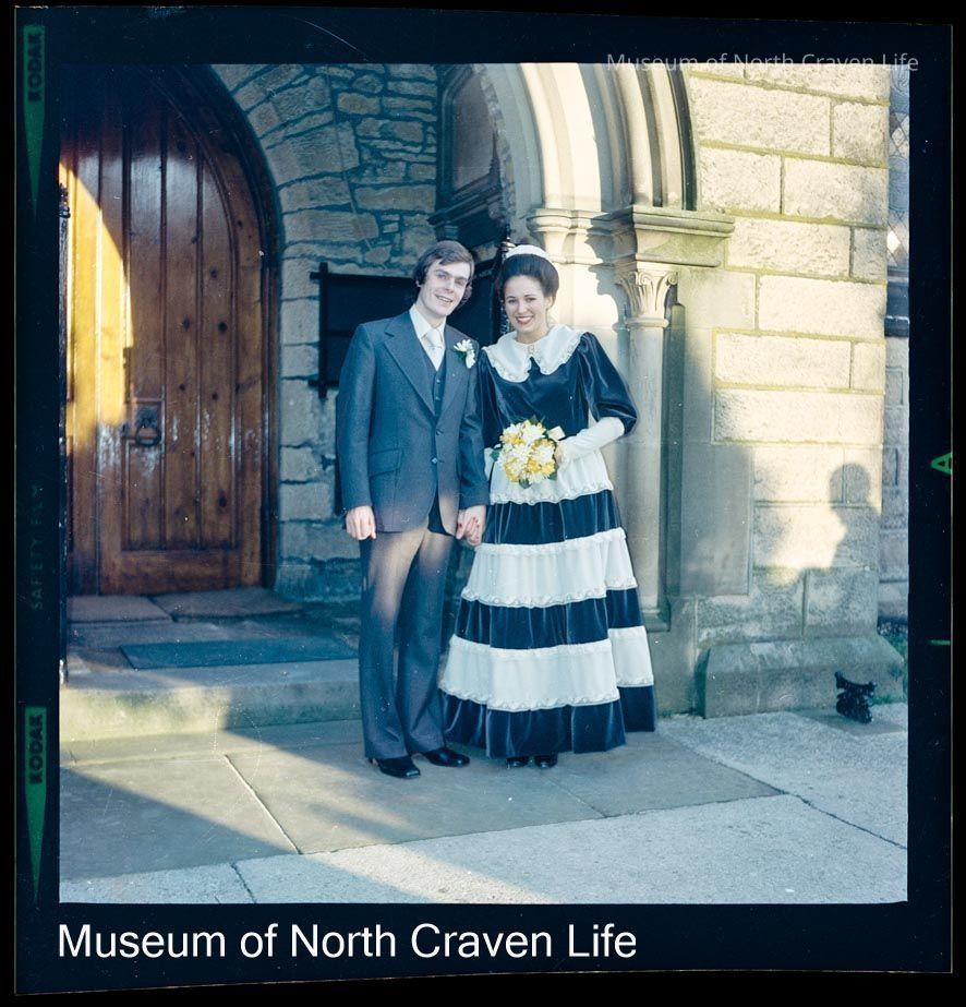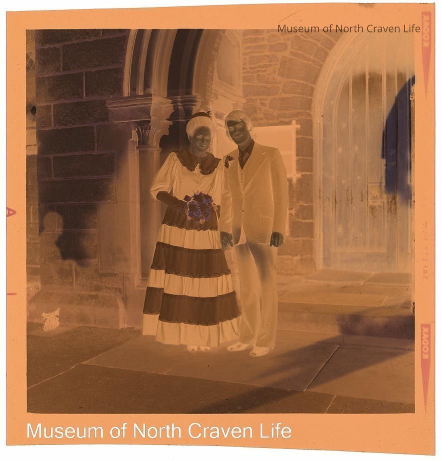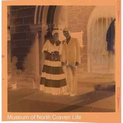 A 2¼" colour film negative. A portrait of a wedding couple standing in a church porch ; the bride holds a bouquet and wears a striped dressCollection