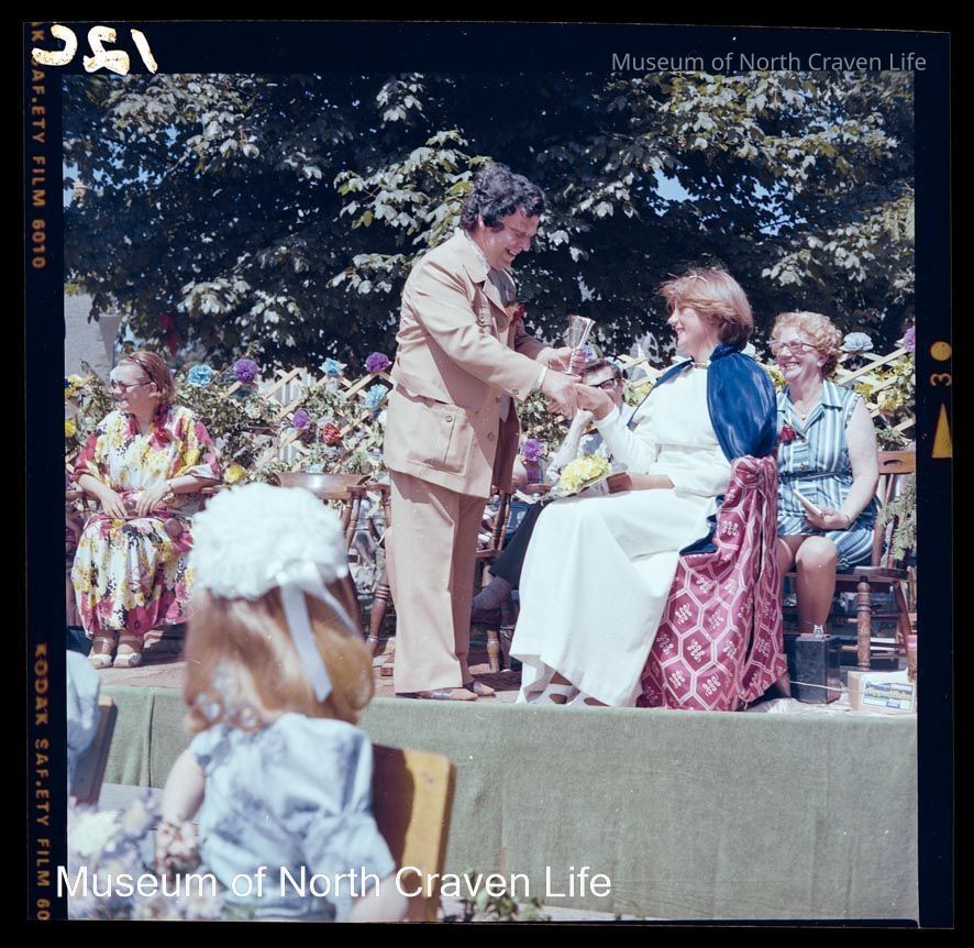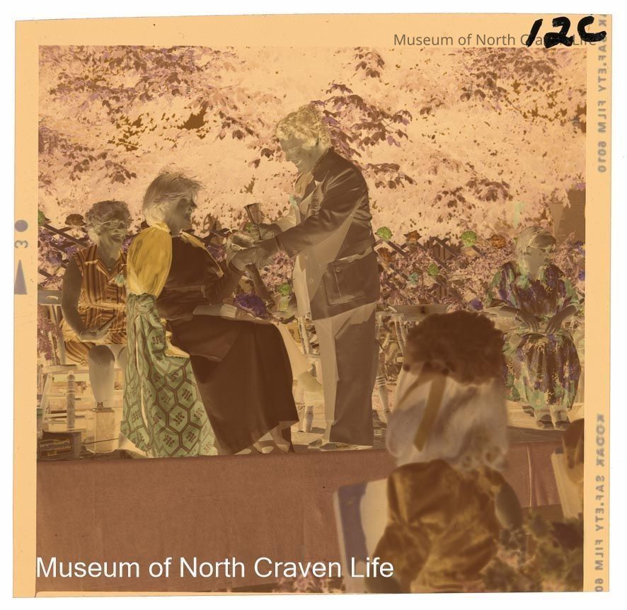 A 2¼" colour film negative. A portrait of a carnival queen seated on a dais surrounded by well-dressed people ; a man presents her with a silver chaliceCollection