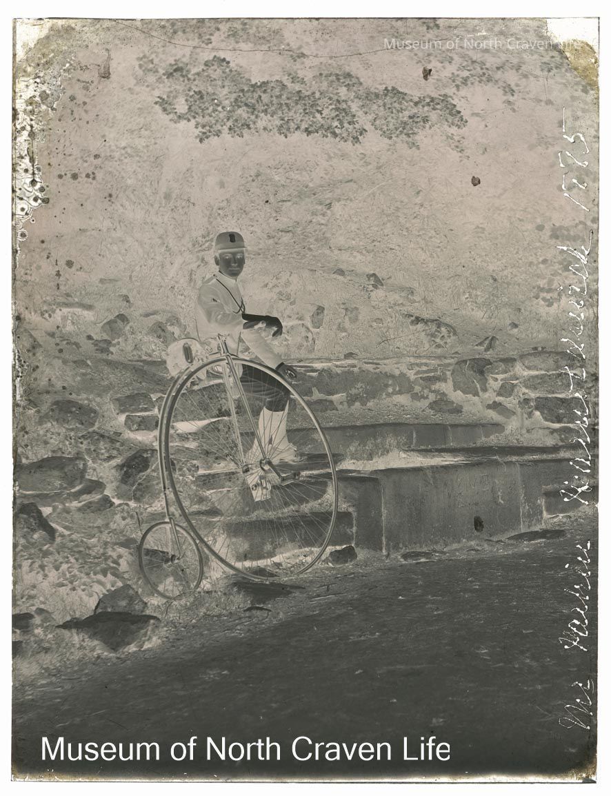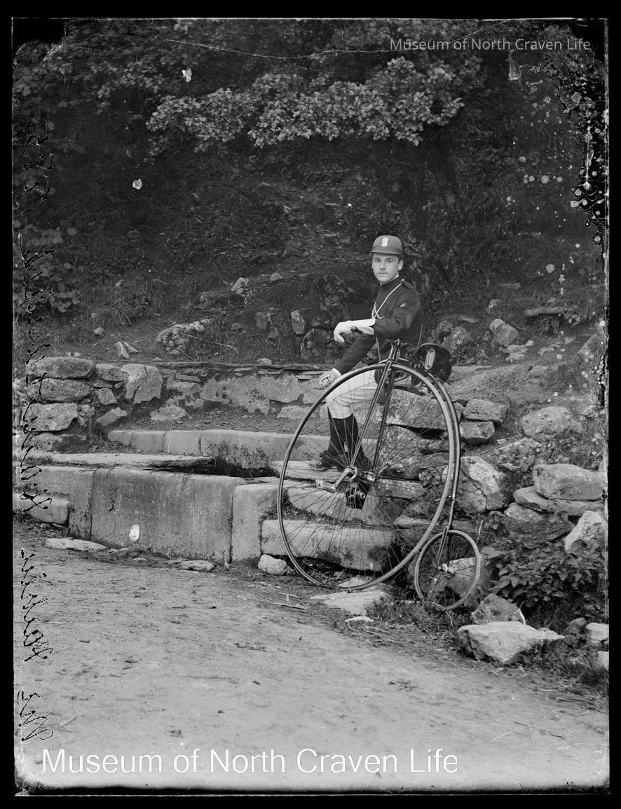 A quarter-plate gelatin silver glass plate negative. A full length portrait of Mr Parker of Hawkswick with his Penny Farthing at the Ebbing and Flowing Well, 1885Collection