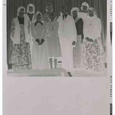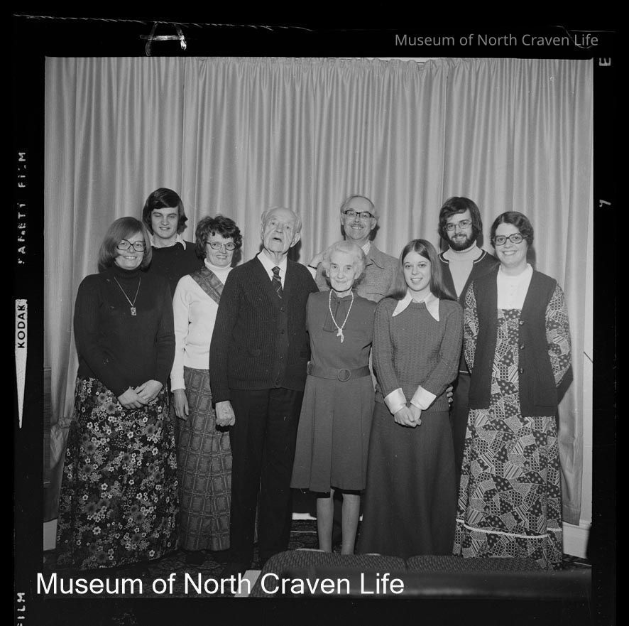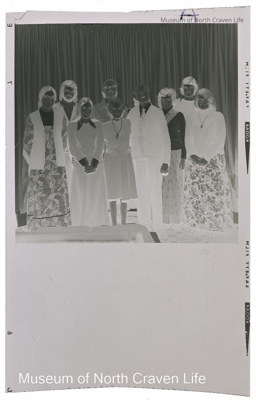 A 2¼" monochrome acetate film negative. A group portrait of seven men and women with an elderly couple in the centreCollection