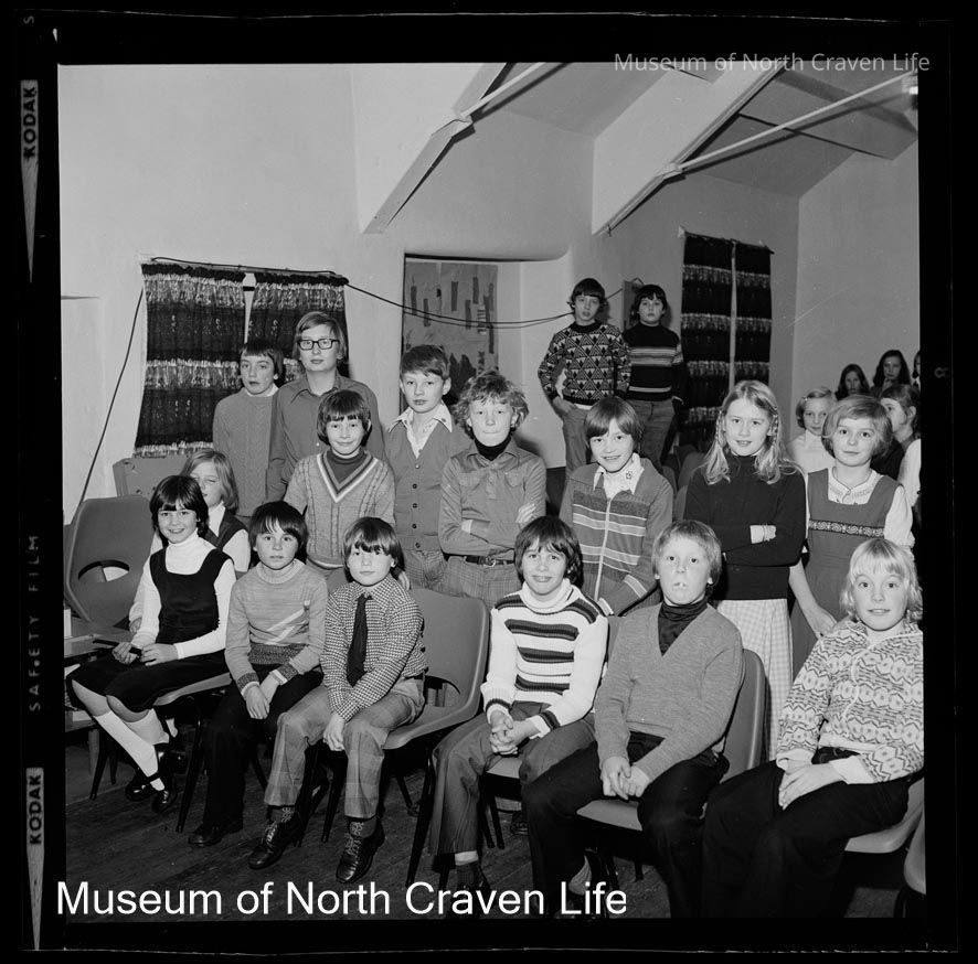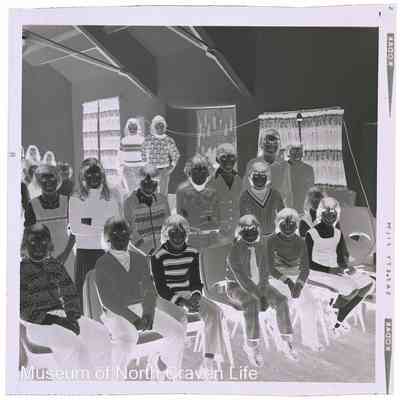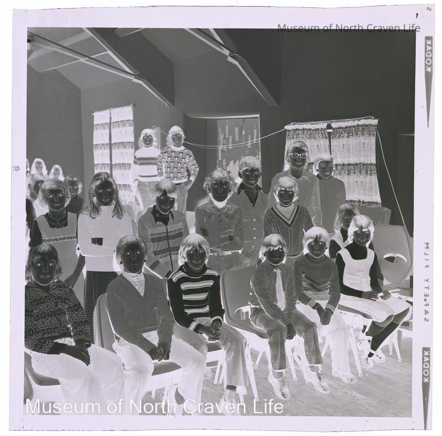 A 2¼" monochrome acetate film negative. A group portrait of children seated in a large roomCollection
