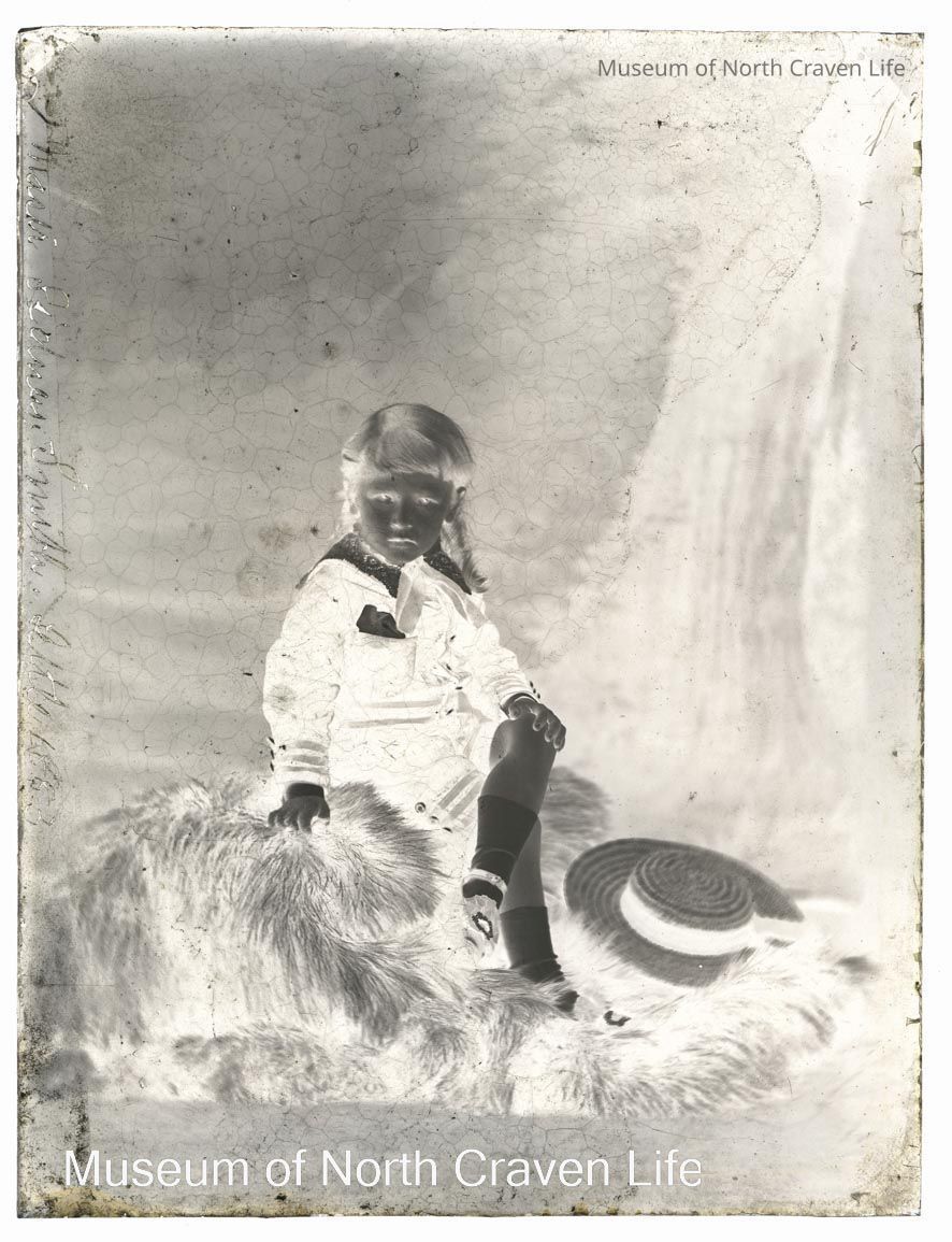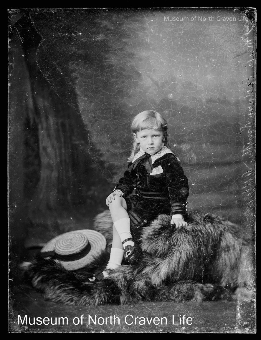 A quarter-plate gelatin silver glass plate negative. A studio seated portrait of Master Sydney Smith, Settle, 1883. He sits on a fur, with straw boater hat on the floor. He wears a dark velvet outfit with short legs, ribbon and lace at the neck. Shoes have rosettes.Collection