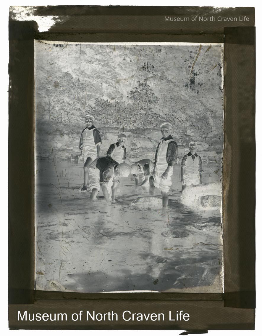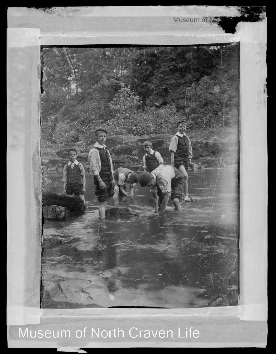 A quarter-plate gelatin silver glass plate negative of six boys paddling in the river, two have their hands in the water. They wear smart matching clothes - shirts with large collars, ties, waistcoats and caps. Tape on all sides.Collection