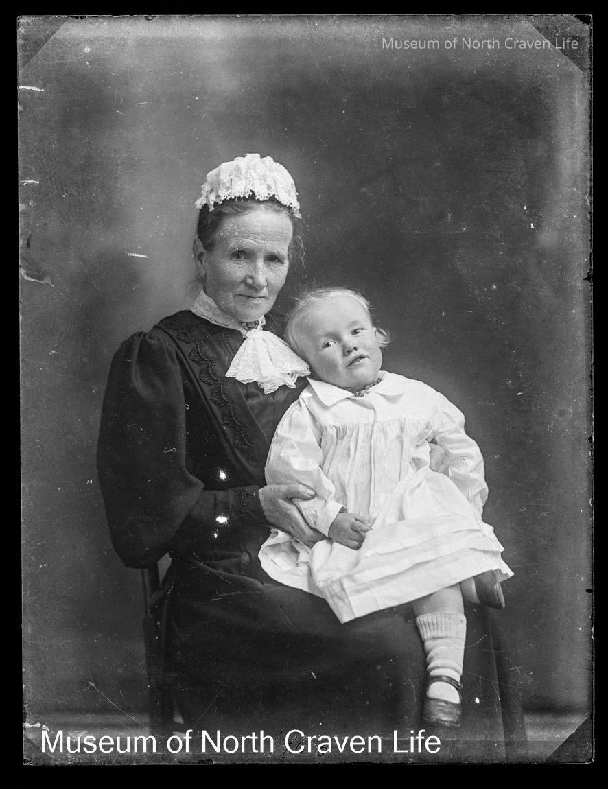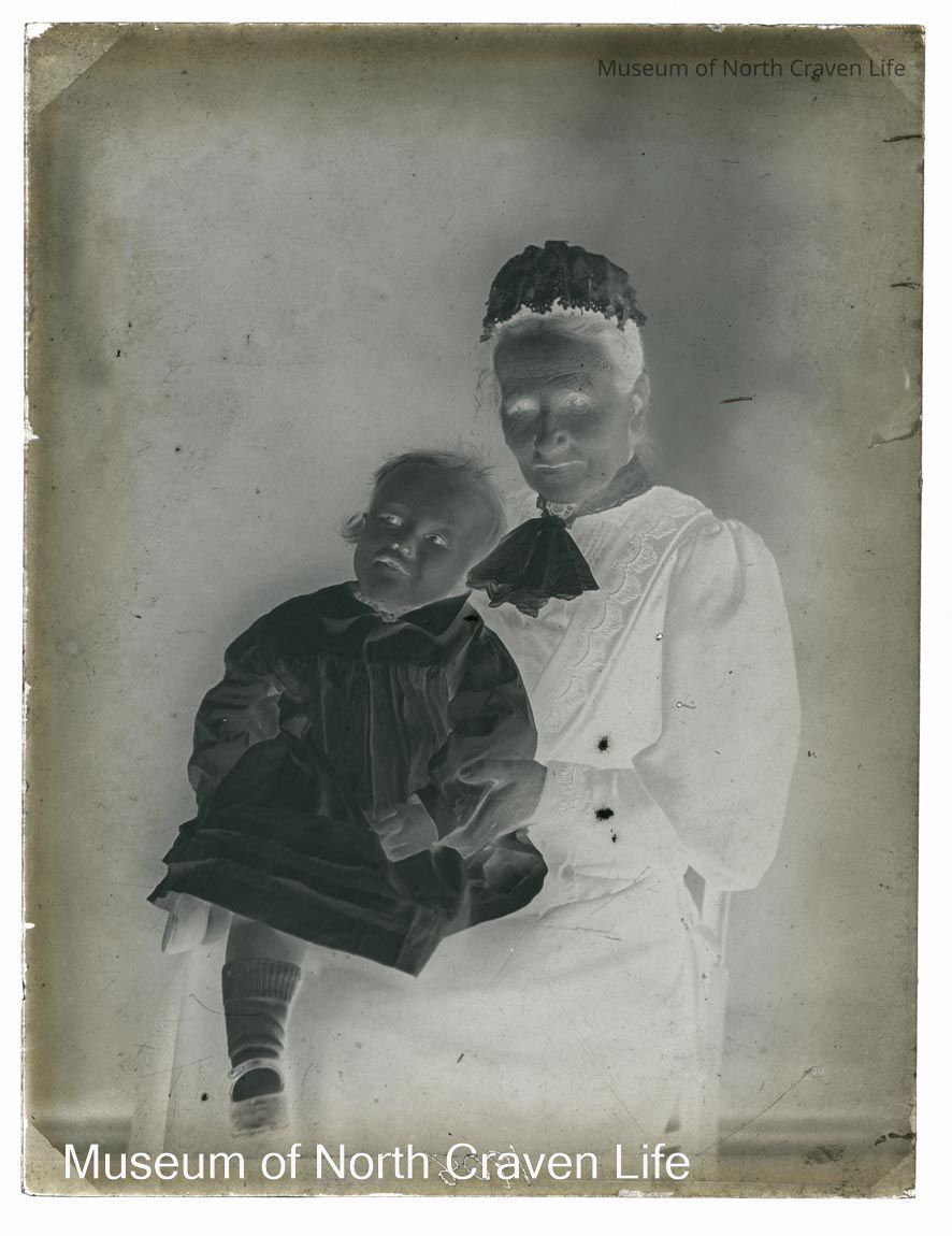 A quarter-plate gelatin silver glass negative. A half-length seated studio portrait of Mrs C. Ann Holmes (nee Cumberland), 1908 with child (possibly Ernest Stanley Horner (b.1907)Collection
