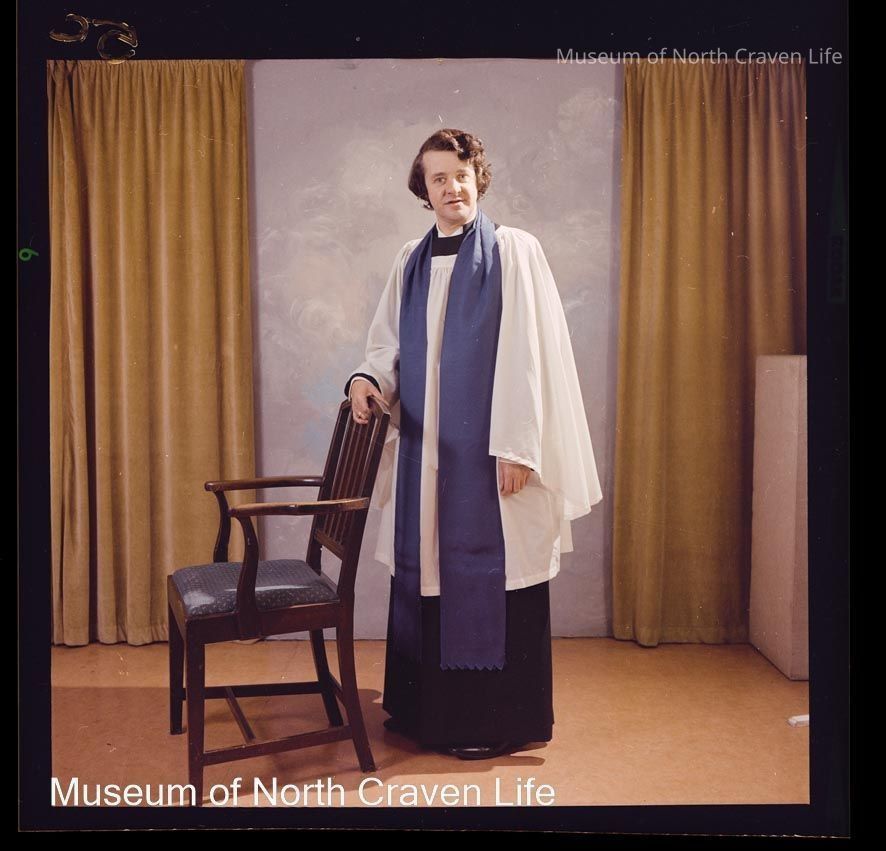A 2¼" colour film negative. A portrait of a cleric standing, in clerical dress, his hand resting on the back of a chairCollection