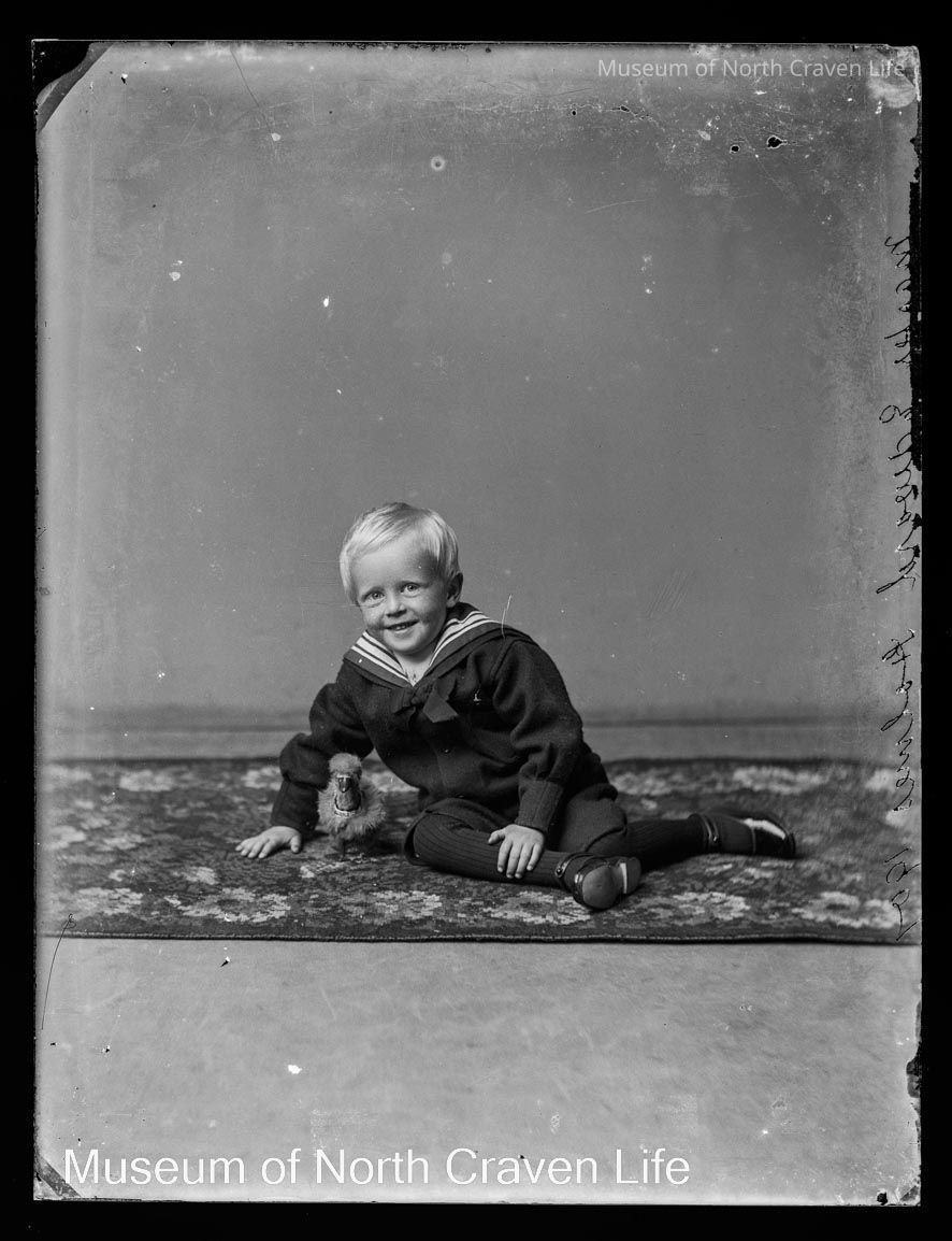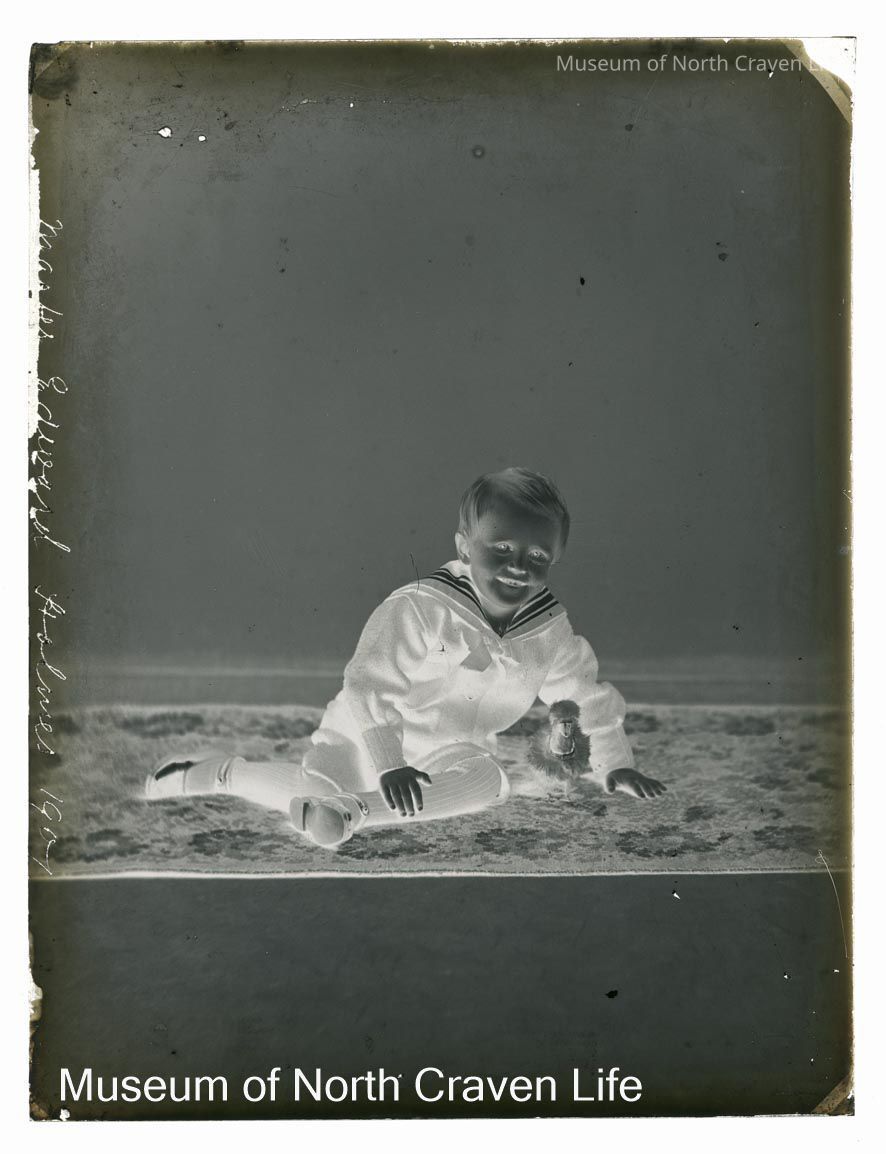 A quarter-plate gelatin silver glass negative. A full length studio portrait of Edward Holmes as a young boy wearing a sailor suit, 1901Collection