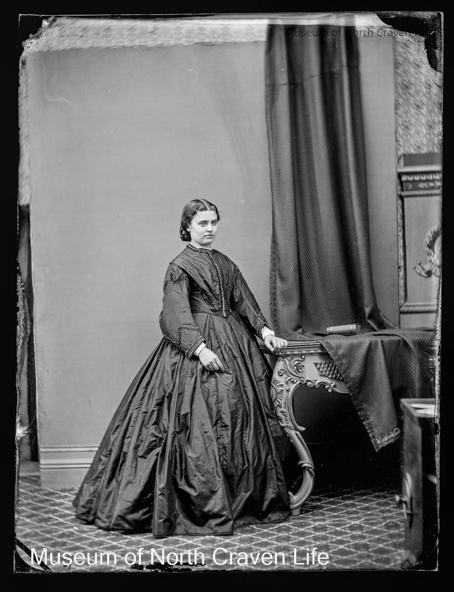 A quarter-plate wet collodion negative. A three-quarter length studio portrait of Miss Stewart, Rose Cottage, Oct 3, 1865. She stands beside a draped table upon which is placed a bookCollection